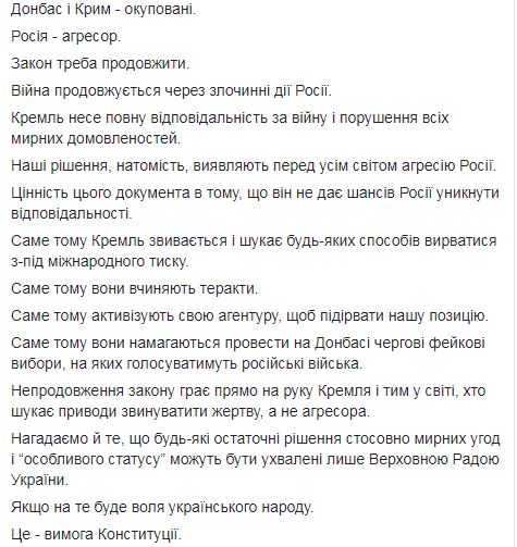 "По твердому убеждению "Народного Фронта", закон должен четко соответствовать принятому по нашей инициативе закона "Об особенностях государственной политики по обеспечению государственного суверенитета Украины на временно оккупированных территориях в Донецкой и Луганской областях" и законодательным актам, которые четко определяют факт агрессии России против Украины на Донбассе и в Крыму", - говорится в сообщении.