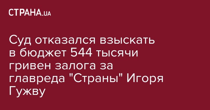 Шевченковский районный суд Киева отказался взыскать в государственный бюджет 544 тысячи гривен залога, который внесли за главного редактора интернет-газеты "Страна.ua" Игоря Гужву в деле о вымогательстве взятки у депутата от Радикальной партии Дмитрия Линько. Об этом сообщают "Украинские новости".