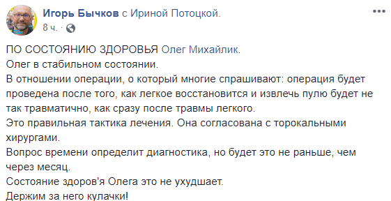 "Олег в стабильном состоянии… Операция будет проведена после того, как легкое восстановится и извлечь пулю будет не так травматично, как сразу после травмы легкого… Вопрос времени определит диагностика, но будет это не раньше, чем через месяц. Состояние здоровья Олега это не ухудшает", - написал Бычков.