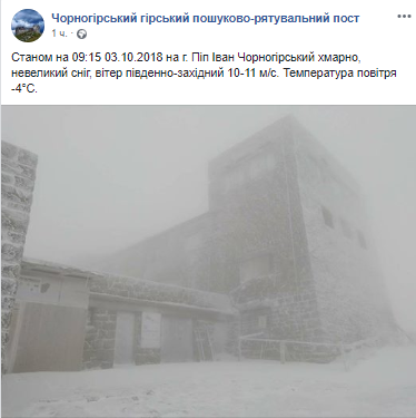 "По состоянию на 09:15 03.10.2018 на горе Поп Иван Черногорский облачно, небольшой снег, ветер юго-западный 10-11 м/с. Температура воздуха -4 градуса", - говорится в сообщении.