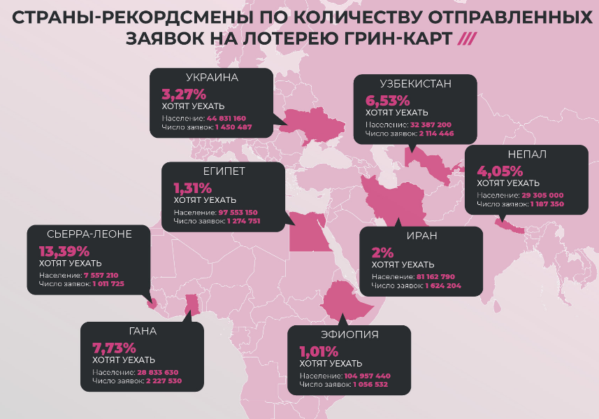 Помимо Украины, лидерами по числу заявок на эмиграцию в США являются Непал, Узбекистан, Иран, Эфиопия, Египет, Гана, Сьерра-Леоне и Египет.