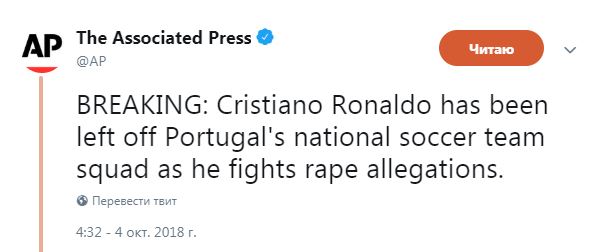 После обвинений в изнасиловании знаменитого нападающего сборной Португалии Криштиану Роналду отстранили от участия в матчах за национальную сборную по футболу. Об этом сообщает AP в Twitter. Роналду отстранен от участия во всех матчах команды во время осеннего сезона, заявил тренер сборной Португалии.