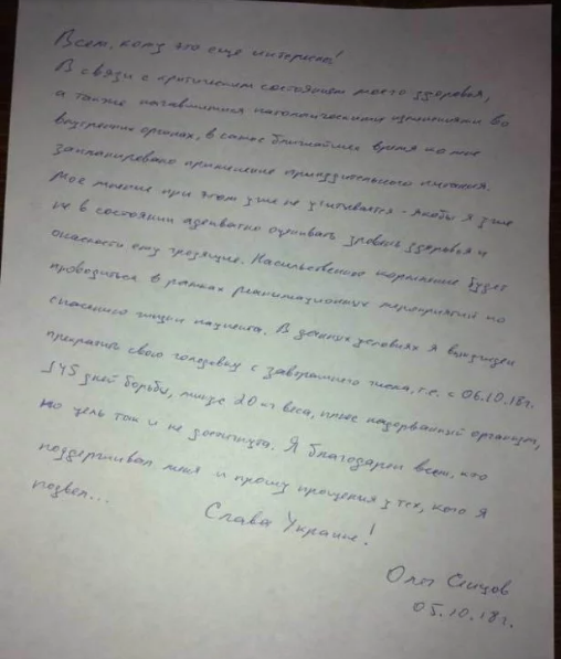 Ряд российский СМИ обнародовали заявление находящегося в заключении в России украинского режиссера Олега Сенцова о прекращении голодовки. Он пишет, что вынужден был пойти на такой шаг из-за угроз насильственного кормления со стороны россиян.