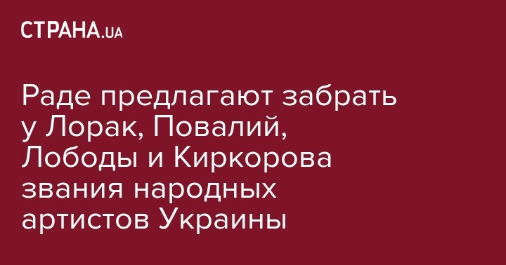 Согласно инициативе, парламент может предложить СНБО лишить звания "народный артист Украины" музыкальных исполнителей Таисию Повалий, Ани Лорак, Светлану Лободу, Виталия Козловского, которые являются гражданами Украины, а также граждан РФ - режиссера Владимира Бортко, певцов Филиппа Киркорова и Николая Баскова.