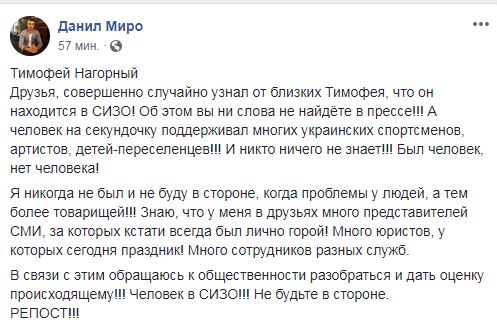 "Друзья, совершенно случайно узнал от близких Тимофея, что он находится в СИЗО! Об этом вы ни слова не найдёте в прессе!!! А человек на секундочку поддерживал многих украинских спортсменов, артистов, детей-переселенцев!!! И никто ничего не знает!!! Был человек, нет человека!", - написал Миро.