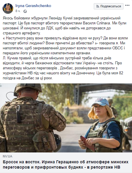 "В следующий раз они привезут отрезанное ухо или руку? Где они взяли паспорт убитого человека? Они причастны к убийству?", - цитирует Геращенко свои же слова.