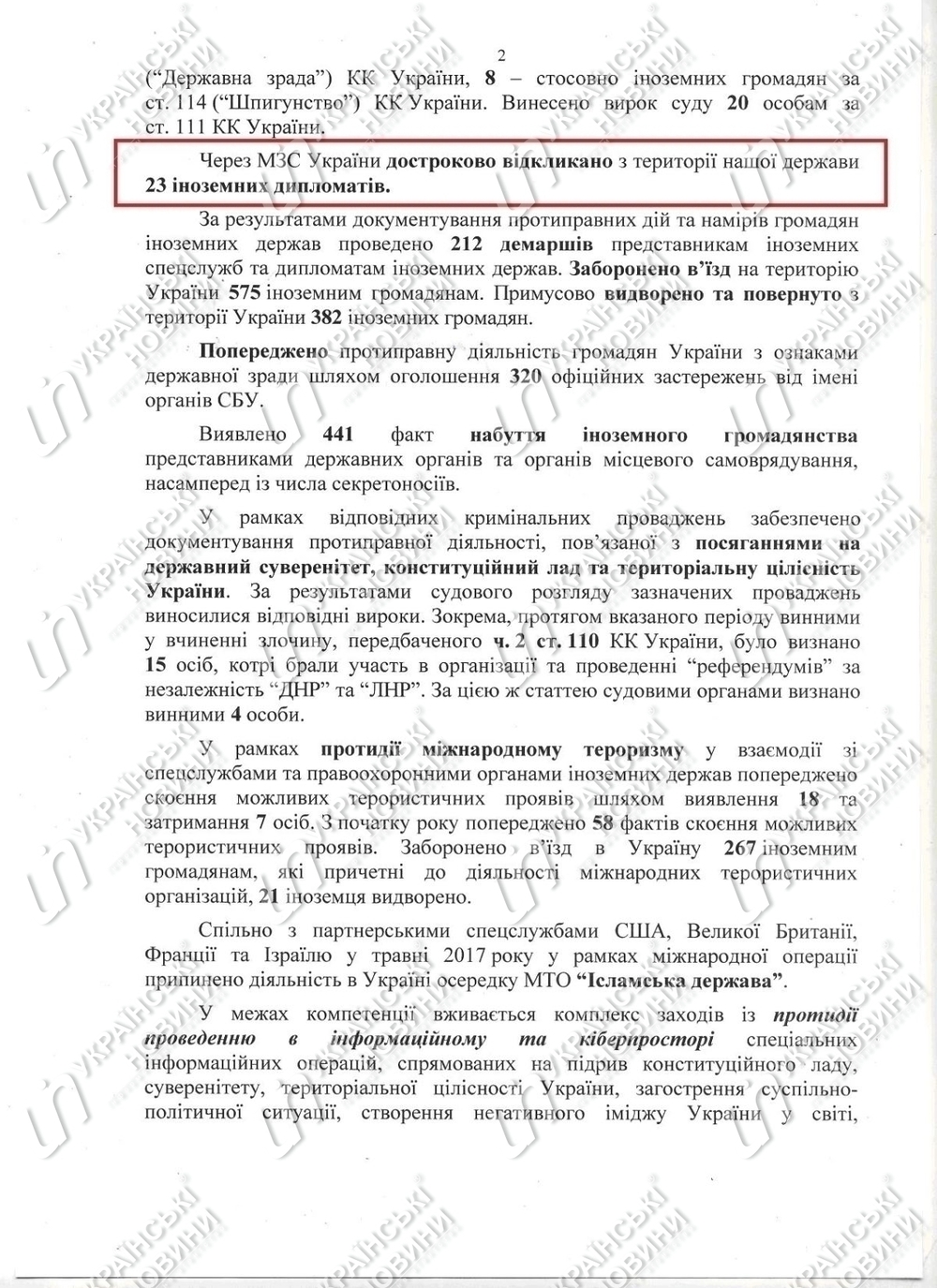 Кроме того, предупреждена противоправная деятельность граждан Украины с признаками государственной измены путем объявления 320 официальных предостережений от имени органов СБУ.