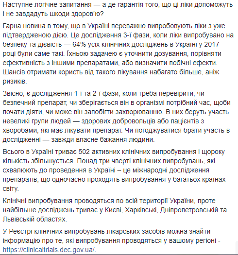 Супрун также сообщила, что в Украине испытывают лекарства с уже подтвержденным действием, что говорит о гарантии. "Это исследование 3-й фазы, когда лекарства испытано на безопасность и действенность - 64% всех клинических исследований в Украине в 2017 году были именно такие. Их задачей является уточнить дозировки, сравнить эффективность с другими препаратами, или определить побочные эффекты. Шансов получить пользу от такого лечения намного больше, чем рисков", - написала Супрун.