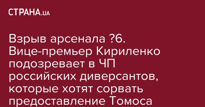 Вице-премьер-министр Украины Вячеслав Кириленко предположил, что причина взрывов на складах 6-го арсенала в Ичне кроется в деятельности российских диверсантов, цель которых - не допустить предоставления Украинской православной церкви Томоса об автокефалии. Об этом он написал в своем аккаунте в Twitter.