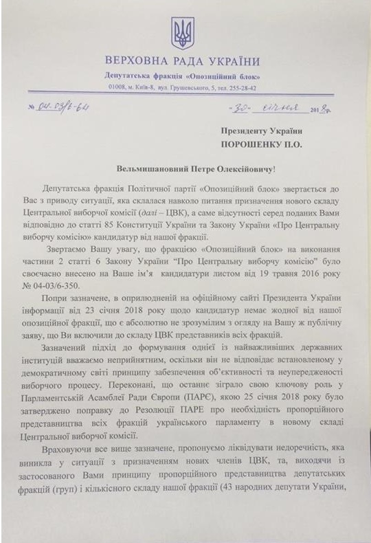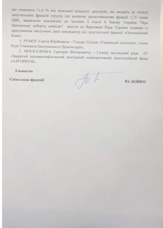В нем нардеп, обращаясь к Порошенко, предлагает в ЦИК две кандидаты от Оппозиционного блока: Румпу Сергея Юрьевича и Москаленко Григория Викторовича.