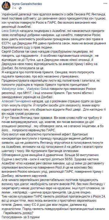 "Докладчик репорта, который мог открыть двери для российской делегации в ПАСЕ без санкций, сама предложит вернуть доклад в Комитет. Это то, что Украина и Группа консерваторов предлагали ещё утром. Перемога близка!", - написал нардеп в Facebook.