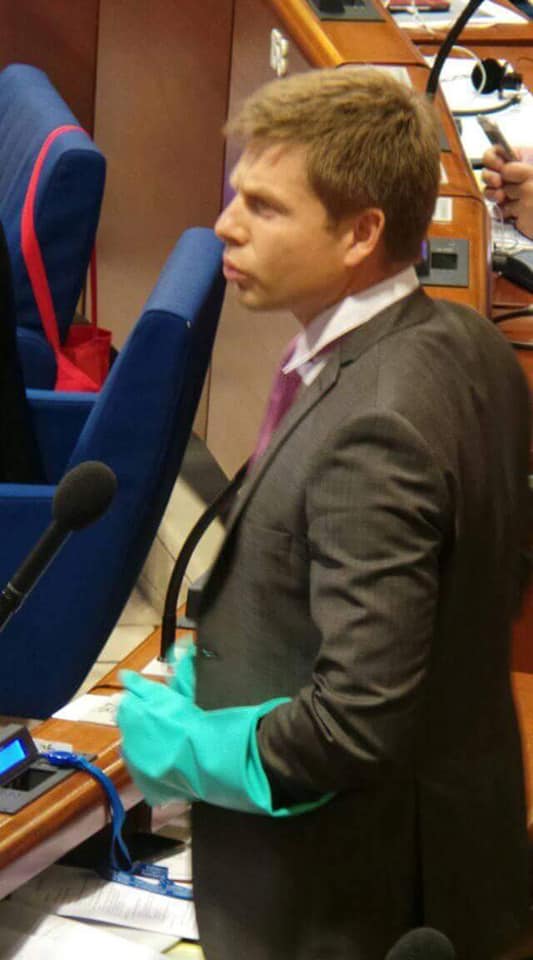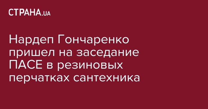 Народный депутат от БПП Алексей Гончаренко пришел на Парламентскую ассамблею Совета Европы в резиновых сантехнических перчатках. Фотографии с Гончаренко появились в социальных сетях. Их обнародовал журналист Руслан Коцаба.
