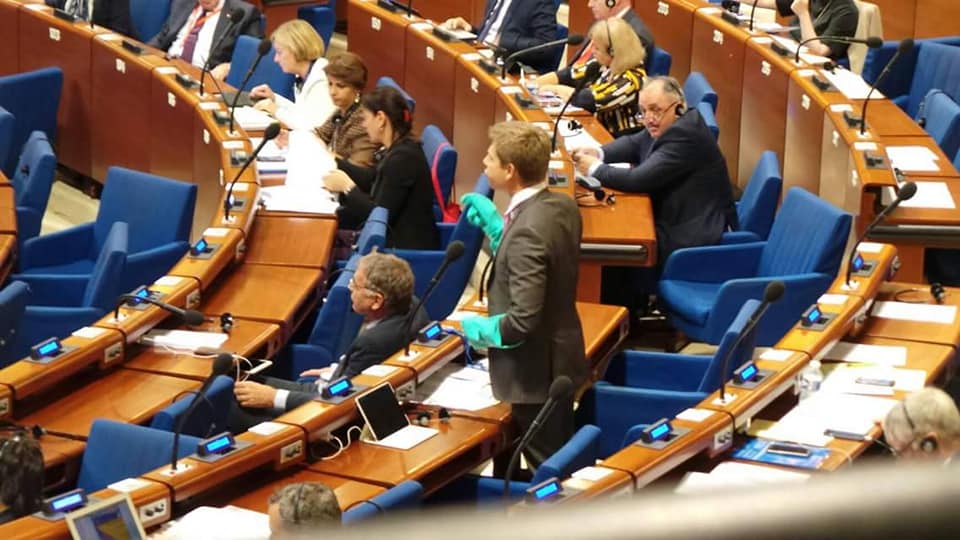 В этих же перчатках Гончаренко выступил перед ПАСЕ по поводу санкций против России. Таким образом он хотел напомнить генсеку Совета Европы Турбьерну Ягланду, который выступает против антироссийских санкций, о причастности России к отравлению людей. "Если вы беретесь за ручку дверей ПАСЕ, не забудьте ее дезактивировать", - сказал представитель украинской делегации. Гончаренко подчеркнул, что Россия причастна к отравлениям, и в ПАСЕ тоже есть опасность стать жертвой отравляющих веществ.