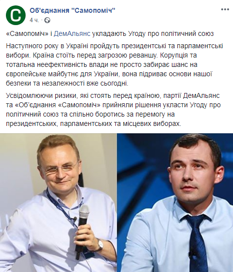 Партии "Самопомощь" и "ДемАльянс" вместе пойдут на выборы. Об этом сказано в сообщении пресс-службы "Самопомощи", опубликованном на странице в Facebook.