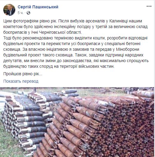 Так, Пашинский сегодня написал в Facebook следующее: "Этим фотографиям ровно год. После взрывов арсеналов в Калиновке нашим комитетом было осуществлено инспекционную поездку в третий по величине склад боеприпасов в Ичне Черниговской области. Тогда было рекомендовано срочно выделить средства, разработать соответствующие строительные проекты и переместить все боеприпасы в специальные бетонные хранилища. По собственной инициативе я заказал и передал в Минобороны строительный проект такого хранилища. Также, благодаря поддержке народных депутатов, мы внесли изменения в законодательство, которые максимально упрощают строительство таких сооружений на территории военных частей".