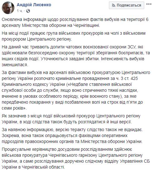 Взрывы снарядов на арсенале возле Ични в Черниговской области могут быть терактом. Об этом на своей странице в социальной сети Facebook сообщил спикер Генпрокуратуры Андрей Лысенко.