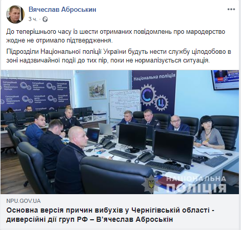 По состоянию на утро 10 октября в Ичне, где вчера взорвались склады боеприпасов, не было зарегистрировано случаев мародерства. Об этом сообщает исполняющий обязанности председателя Национальной полиции Украины Вячеслав Аброськин в Facebook.