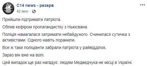На своей странице в Facebook представители С14 показали лицо радикала уже без маски без указания имени. Его встречали у райотдела полиции. Он был задержан после нападения. В участке полиция установила его личность, взяла объяснения и отпустила вместе еще с тремя задержанными.
