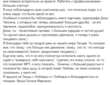 "Во время подготовки к прямым эфирам, на репетиции, я сломала два ребра. Это была очень острая боль, но я подумала, что сильно потянула связки или мышцы, принимала обезболивающее и, сцепив зубы, продолжала репетировать. Временами боль была нестерпимой, я шла в раздевалку, плакала, чтобы никто не видел, ставила себе еще более сильные обезболивающие инъекции и снова репетировала", - написала Оксана Марченко, отметив, что участие в шоу было очень важно для нее, поскольку это мечта ее дочери.