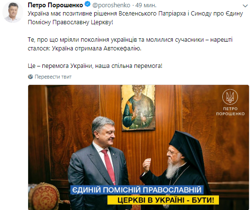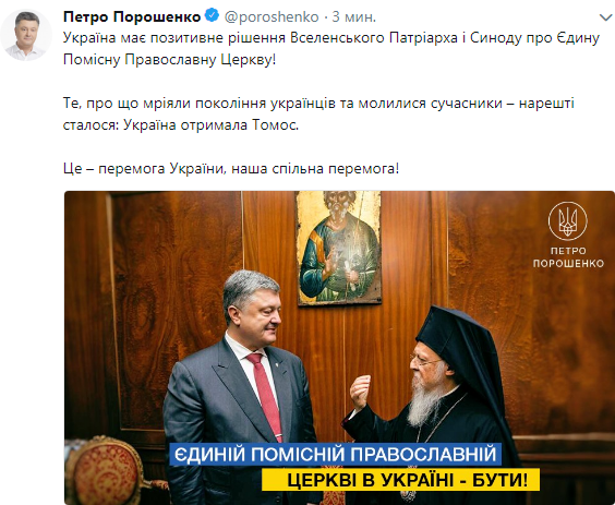 В первые минуты на странице Петра Порошенко в Twitter появилось поздравление с тем, что Украина получила Томос. Позже оно было удалено, а Томос заменили на Автокефалию.