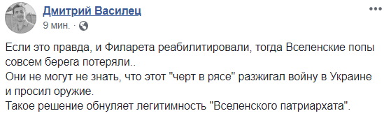 "Если это правда, и Филарета реабилитировали, тогда Вселенские попы совсем берега потеряли. Они не могут не знать, что этот "черт в рясе" разжигал войну в Украине и просил оружие. Такое решение обнуляет легитимность "Вселенского патриархата"", - пишет журналист Дмитрий Василец.