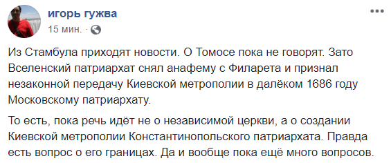 То есть, пока речь идёт не о независимой церкви, а о создании Киевской метрополии Константинопольского патриархата. Правда есть вопрос о его границах. Да и вообще пока ещё много вопросов", - пишет главный редактор "Страны" Игорь Гужва.