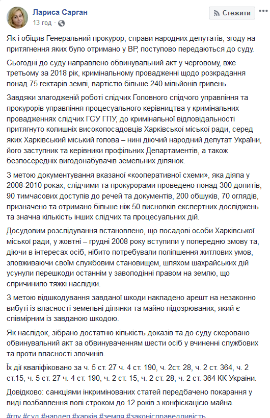 "Досудебным расследованием установлено, что должностные лица Харьковского городского совета, в октябре - декабре 2008 года вступили в предварительный сговор и, действуя в интересах лиц, которые якобы нуждались в улучшении жилищных условий, злоупотребляя своим служебным положением, путем мошеннических действий устранили препятствия последнему в завладении правом на землю, что повлекло тяжкие последствия. С целью возмещения причиненного ущерба наложен арест на незаконно выбывшие из собственности земельные участки и имущество подозреваемых, который является соразмерным с причиненным ущербом", - написала Лариса Сарган.