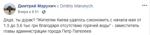 "Если человек потребляет в среднем 2-3 кубометра в месяц, то семья из трех человек, которая с мая была без горячей воды, сэкономила 3-3,6 тысячи гривен. Киевляне, которые остались без горячей воды с августа (Оболонь, Троещина, часть Подола), – сэкономили 1,5 тысячи. Но люди все равно грели воду на газовых или электрических плитах и платили за газ или электричество", - подсчитал заммэра.