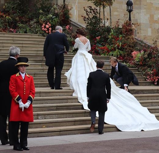 К алтарю принцесса Евгения пошла счастливо улыбаясь. За музыкальное сопровождение во время церемонии в часовне Святого Георгия отвечал Королевский филармонический оркестр под управлением Джеймса Уильямса и приглашенный почетный гость, легендарный итальянский певец Андреа Бочелли.