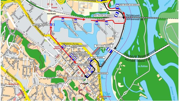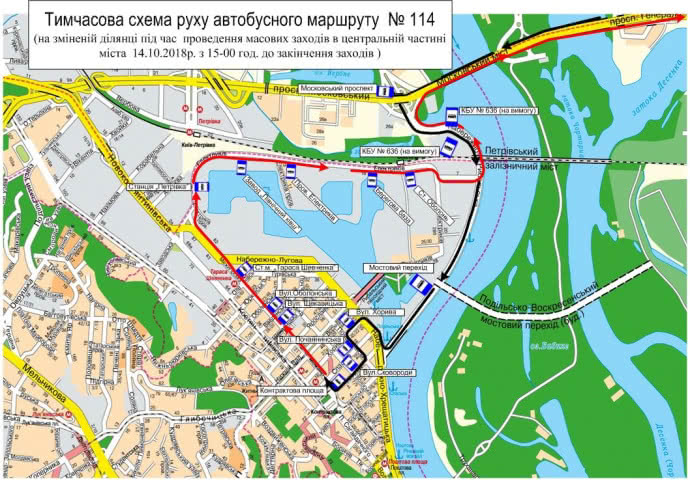автобусы маршрута № 114 от ул. Милославской до Гаванского моста по собственному маршруту, далее - ул. Набережно-Крещатицкая - ул. Хорива - ул. Почайнинская - ул. Григория Сковороды - ул. Межигорская - ул. Электриков - ул. Набережно-Рыбальская, дальше по собственному маршруту;