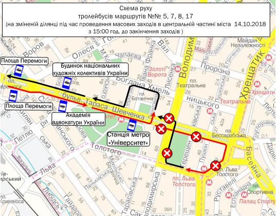 14 октября с 15:00 в связи с проведением массовых мероприятий в центральной части города ко Дню защитника Украины и соответствующим запретом движения всех видов транспорта на ул. Владимирской (на участке от ул. Льва Толстого до бульвара Тараса Шевченко), б-ре Тараса Шевченко (на участке от ул. Владимирской до Бессарабской площади), ул. Крещатик (на участке от Бессарабской площади до Европейской площади), Европейской площади вносятся изменения в работу наземного общественного транспорта.