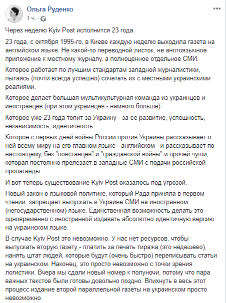 "В случае Kyiv Post это невозможно. У нас нет ресурсов, чтобы выпускать вторую газету - платить за печать тиража (это недешево), нанять штат людей, которые будут (очень быстро) переписывать статьи на украинском. Наконец, это просто невозможно с точки зрения логистики. Вчера мы сдали новый номер к полуночи, потому что пара важных текстов были готовы довольно поздно. Впихнуть в весь этот процесс издание второй параллельной газеты на украинском просто невозможно", - пишет Ольга Руденко