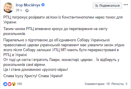"Вот тогда эта секта и потеряет лавры, монастыри, церкви... Их отберут у раскольников сами верующие. Это и станет гробом "русского мира"!", - написал Мосичук.