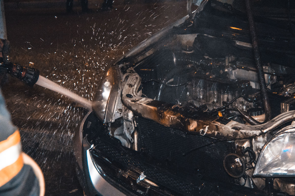 Предварительно установлено, что от удара об бордюр, в автомобиле перебилась газовая магистраль и он загорелся.