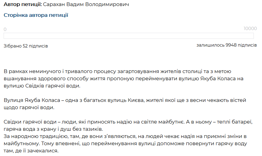 Автор предлагает переименовать улицу Якуба Коласа, это одна из многих улиц Киева, жители которой еще с весны ждут вестей о горячей воде. "Свидетели горячей воды - люди, которые приносят надежду на светлое будущее. А в нем - теплые батареи, горячая вода из крана и душ без тазиков", - объясняет автор петиции.