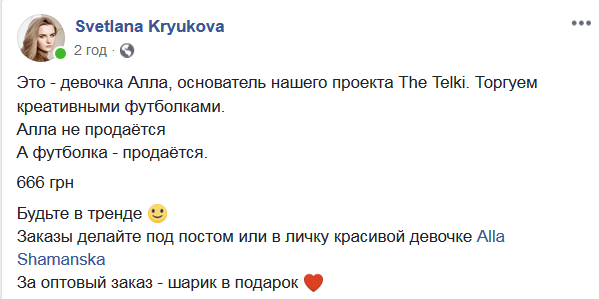 "Это - девочка Алла, основатель нашего проекта The Telki. Торгуем креативными футболками. Алла не продаётся. А футболка - продаётся. 666 грн. Будьте в тренде. Заказы делайте под постом или в личку красивой девочке Alla Shamanska. За оптовый заказ - шарик в подарок", - написала Светлана Крюкова.