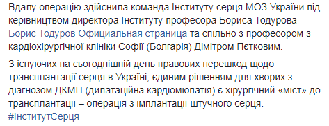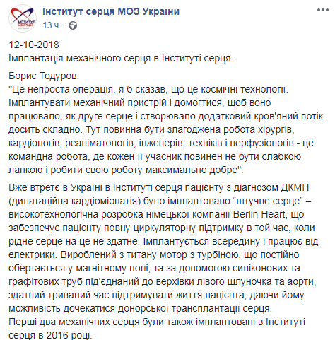 "Это непростая операция, я бы сказал, что это космические технологии. Имплантировать механическое устройство и добиться, чтобы оно работало, как второе сердце и создавало дополнительный кровяной поток достаточно сложно", - прокомментировал операцию директор Института сердца Богдан Тодуров.
