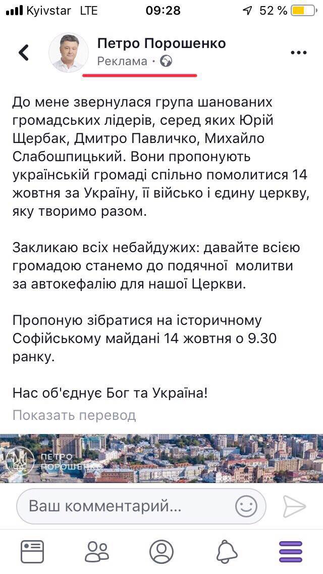 Президент Петр Порошенко в Facebook рекламировал посты о проведении молебна в Киеве. Платную рекламу Порошенко запустил с момента публикации поста в сети 12 октября.