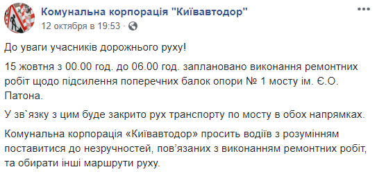 "15 октября с 00:00 до 06:00 запланировано выполнение ремонтных работ по усилению поперечных балок опоры № 1 моста им. Патона. В связи с этим будет закрыто движение транспорта по мосту в обоих направлениях", – говорится в сообщении.