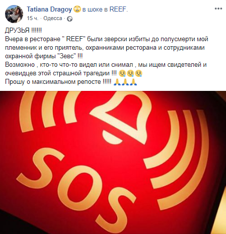 13 октября у ресторана REEF в Одессе произошла драка - был избит молодой человек. По словам родственницы пострадавшего Татьяны Драгой, побои мужчине нанесли сотрудники охранной фирмы "Зевс".