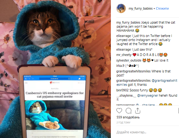 Тем временем кот Джоуи (именно он был на снимке, прикрепленном к приглашению) сфотографировался с планшетом, на котором открыта статья про несостоявшуюся вечеринку в пижамах. Владелица животного написала, что кот расстроен.