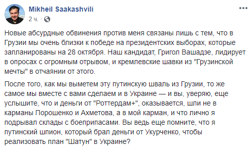 "Новые абсурдные обвинения против меня связаны лишь с тем, что в Грузии мы очень близки к победе на президентских выборах, которые запланированы на 28 октября. Наш кандидат, Григол Вашадзе, лидирует в опросах с огромным отрывом, и кремлевские шавки из "Грузинской мечты" (партии принадлежит большинство в парламенте страны) в отчаянии от этого.