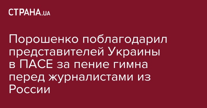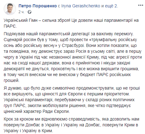 "Украинский гимн – сильное оружие! Это доказали наши парламентарии в ПАСЕ. Поблагодарил нашу парламентскую делегацию за важную победу. Сценарий россиян был в том, чтобы провести "триумфальную российскую осень или русскую весну" в Страсбурге. Они хотели показать, что то поведение, которое демонстрирует сейчас Россия во всем мире, но в первую очередь в Украине во время незаконной аннексии Крыма, во время агрессии против нас на востоке нашего государства, является приемлемым и что никуда западные демократии не денутся, проглотят и все можно решить деньгами, в том числе взносом или не взносом в бюджет ПАСЕ российских денег", - заявил Порошенко.