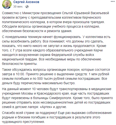 По словам Аксенова, похороны состоятся завтра в 10:00. "На совещании принято решение о выделении средств: 1 млн рублей семьям погибших и по 500 тысяч рублей семьям пострадавших. Все деньги будут перечислены максимально быстро", - сообщил Аксенов.