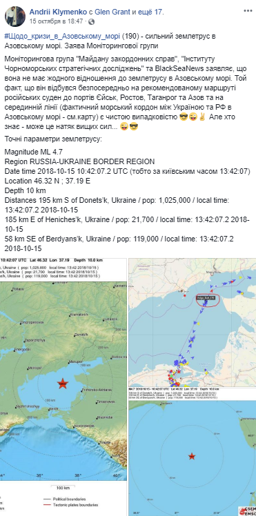 "Тот факт, что оно (землетрясение - ред.) произошл непосредственно на рекомендованном маршруте российских судов в порты Ейск, Ростов, Таганрог и Азов и на срединной линии (фактический морской границе между Украиной и РФ в Азовском море) является чистой случайностью. Но кто знает - может это намек высших сил", - намекнул на "чудо-оружие" Украины морской эксперт Андрей Клименко.