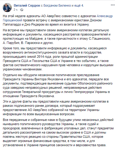 Адвокаты, защищающие экс-президента Украины Виктора Януковича (АО АверЛекс) на этой неделе встретились с американскими юристами Джоном Паппалардо и Джо Ридером во время их визита в Украину. Об этом на своей странице в соцсети сообщил адвокат Виталий Сердюк.