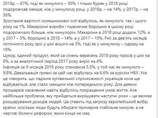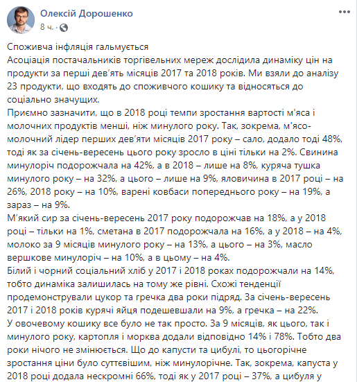 "В частности, мясо-молочный лидер первых девяти месяцев 2017 - сало, добавило тогда 48%, тогда как за январь-сентябрь этого года выросло в цене только на 2%. Свинина в прошлом году подорожала на 42%, а в 2018 - на 8%, куриная тушка прошлого года - на 32%, а в этом - на 9%, говядина в 2017 году - на 26%, 2018 года - на 10%, вареные колбасы предыдущего года - на 19%, а сейчас - на 9%", - написал Дорошенко.
