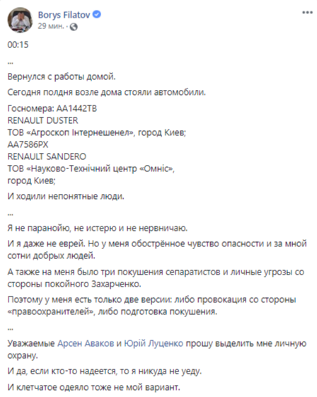 Мэр Днепра Бориc Филатов разместил в Facebook пост о подозрительных автомобилях под своим домом, а также "непонятных людях". По его мнению, это может быть связано или с подготовкой покушения на него, или же провокацией силовиков.