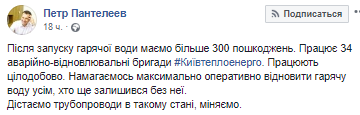 "После запуска горячей воды имеем более 300 повреждений. Работают 34 аварийно-восстановительные бригады Киевтеплоэнерго. Работают круглосуточно. Стараемся максимально оперативно восстановить горячую воду всем, кто еще остался без нее. Получаем трубопроводы в таком состоянии, меняем", - посетовал в Facebook чиновник.