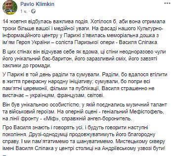 "В этих стенах он (Василий Слипак - Прим. Авт.) чувствовал себя как дома, эти стены неоднократно слышали уникальный бас-баритон, его заразительный смех, его рьяные призывы к обществу... Он был уникальной личностью, в которой соединились музыкальный талант и военный героизм. На оперной сцене - гениальный Мефистофель, на линии фронта - "Миф", настоящий ангел-оборонитель", - написал в соцсети Климкин.